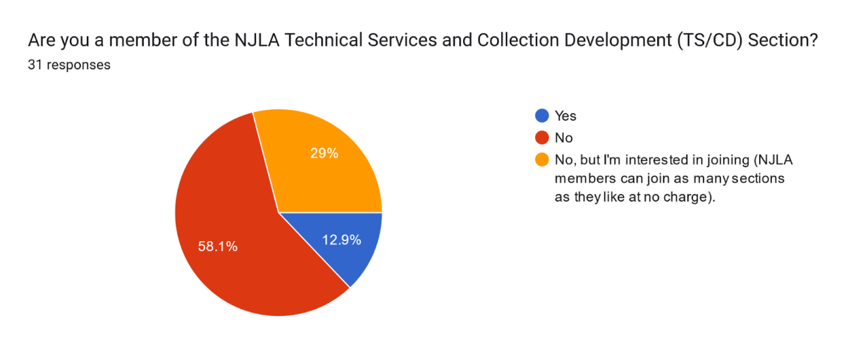 In September 2022, the NJLA's Technical Services and Collection Development (TS/CD) Section asked the PD Committee to create an in-depth survey about cataloging and collection development to learn more about programming needs for their section. The PD Committee released a similar survey in January 2022: Collection Development, Lending, and Technology. Both groups met via Zoom to plan the survey in October 2022. The survey was released to members of NJLA on January 27 and ran through February 28, 2023. It received 31 responses. The survey was promoted in three emails from NJLA to its members. Similar to the previous collection development survey, it contained multiple choice questions to determine which topics members were most interested in to determine future programming. The PD Committee shared the results with the TS/CD Section.