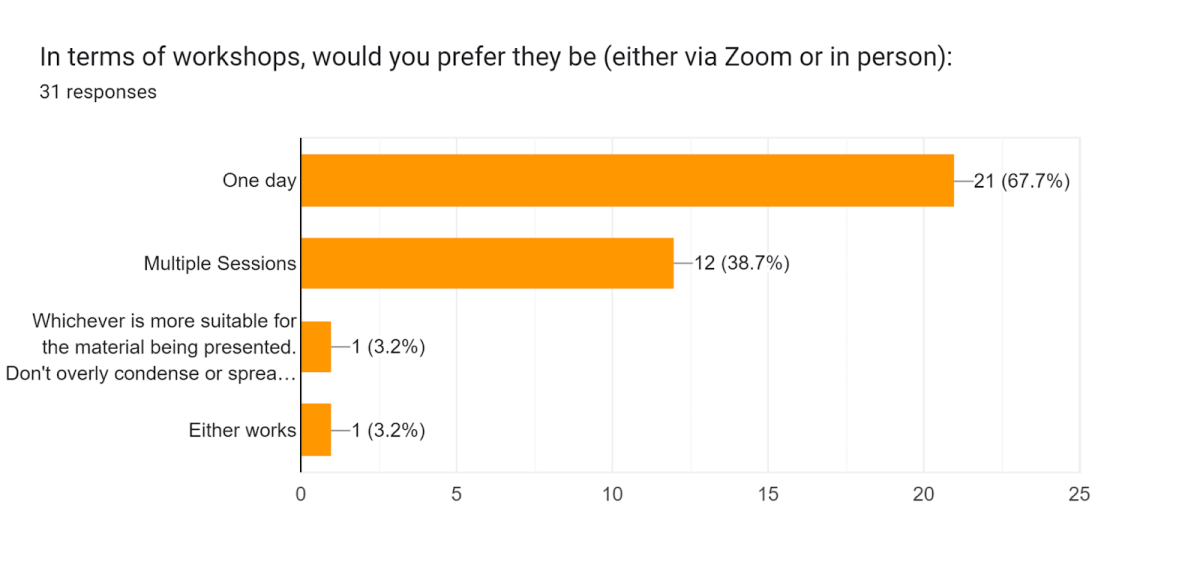 Forms response chart. Question title: In terms of workshops, would you prefer they be (either via Zoom or in person):. Number of responses: 31 responses.