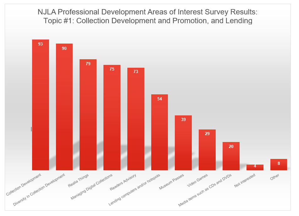 NJLA’s Professional Development Committee conducted a survey in May 2022, seeking the responses of NJLA members and other library workers, about areas they would like to learn about in order to provide programming to their libraries' community/patrons. This survey, the third of three planned, ran from May 6-31, 2022, and received 34 responses. This survey was promoted in four emails from the NJLA to members, and in the May issue of the PD Newsletter.
