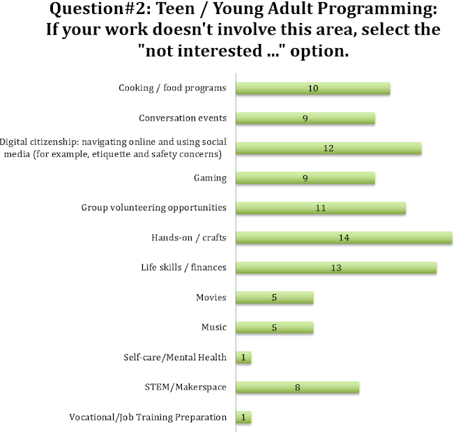The survey had five questions. The first three questions were multiple choice (on programming for Children, Teens/Young Adults, and Adults). Respondents could choose as many programs as they were interested in, or if their work did not involve that area, choose “not interested in this area.” They could also enter their own “other” suggestions. (In the charts below, all of the answers with one respondent were “other” answers.)