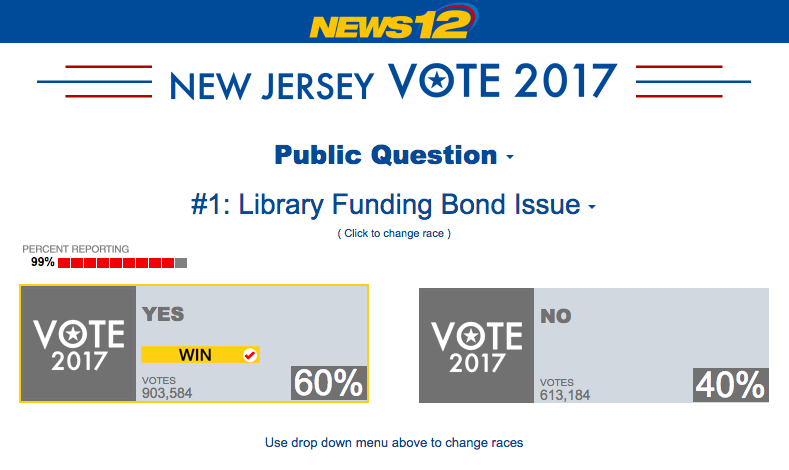 We did it! With 99% precincts reporting, the NJ Library Construction Bond Act has passed with 903,584 votes in favor. Approval of this legislation will result in $125 million in matching funds for capital projects at public libraries in New Jersey. This funding will have a tremendous impact on communities across our great state.